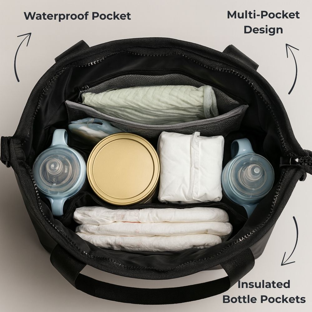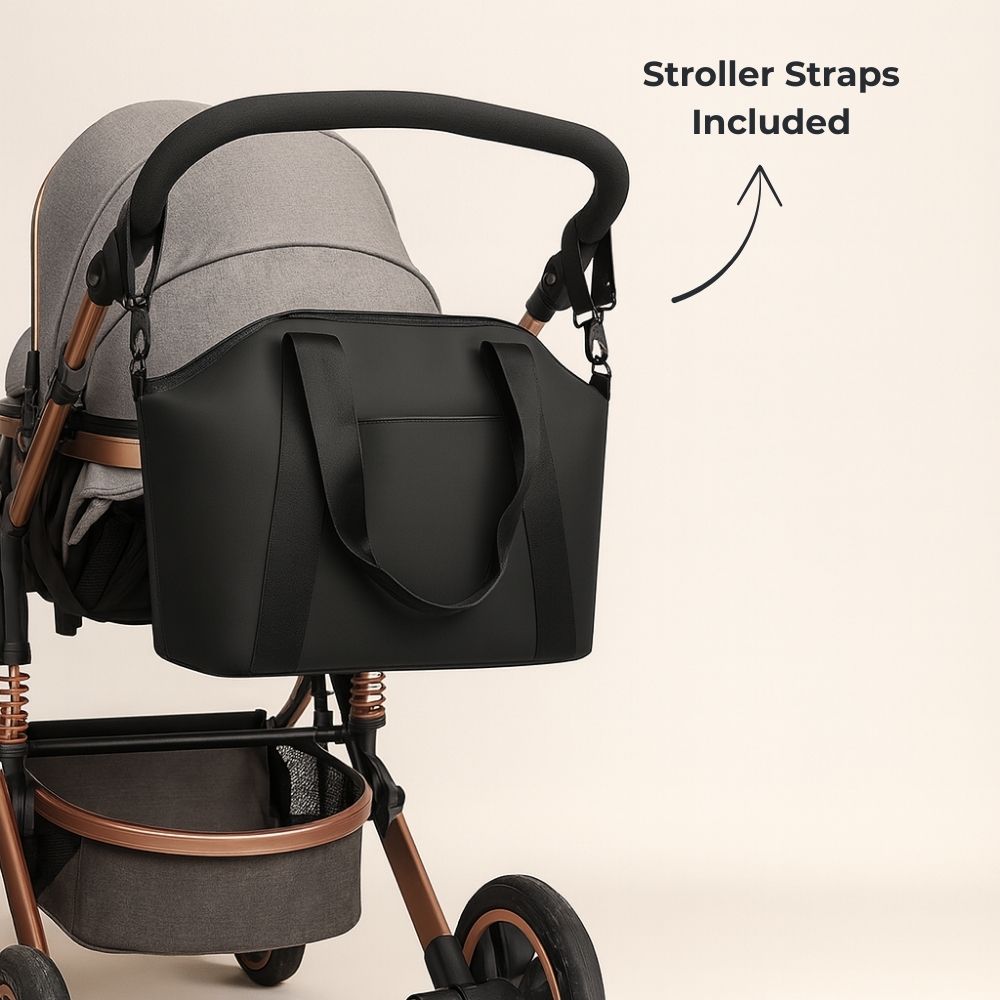 Stylish, functional, and designed for everyday family life, the Black Pearl Baby Changing Tote Bag keeps every essential right where you need it. Its waterproof pocket and insulated bottle sleeves make outings smoother, while the sleek black design complements any outfit. Lightweight yet spacious, it’s your go-to companion for travel, errands, or everyday adventures.